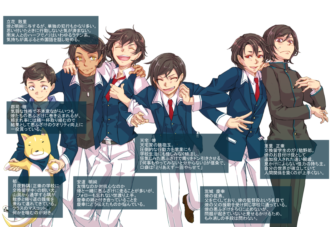 6人分軍服描くのは面倒なんだがそれぞれの私服を考えられないと悩みながら描いていたらいつの間にか学校の制服に落ち着いていました。実際には燎・慶幸・安達のあたりと、立花・重里・郡司のあたりは10歳前後の年差がありますので、同輩だったらどんな感じなのかなぁと考えて私は割と楽しかったです。貧乏性なので追記に突っ込んでおきます。